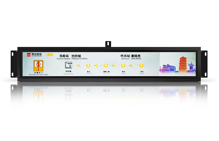lcd條形屏車內導乘牌28.6寸,內嵌4GByte存儲器,可外擴32G存儲卡,顯屏的信息控制采用485通訊。以公交自身運營發展需要為前提,能夠滿足一機多條公交線路站點信息服務的系統設備。其主要功能是能夠根據車輛實際運營狀態,按預設程序智能獨立運行,正確表達車輛當前運行線路名稱、首末班發車時間、運行方向、進出站等實時信息情況,并按需可在儲存的多條公交線路站點信息間切換選擇,同時具備對預設圖片、視頻信息進行循環播放,以滿足車輛靈活快速地跨線調度運行的需要。