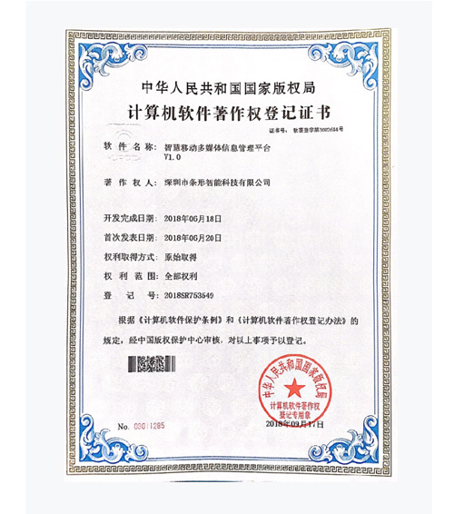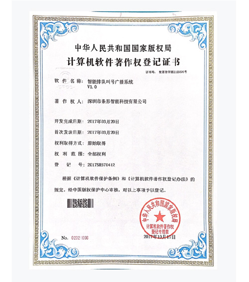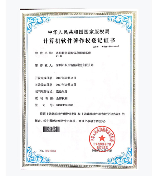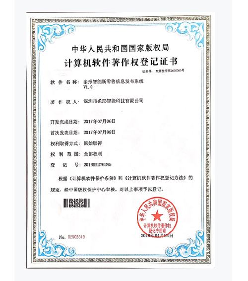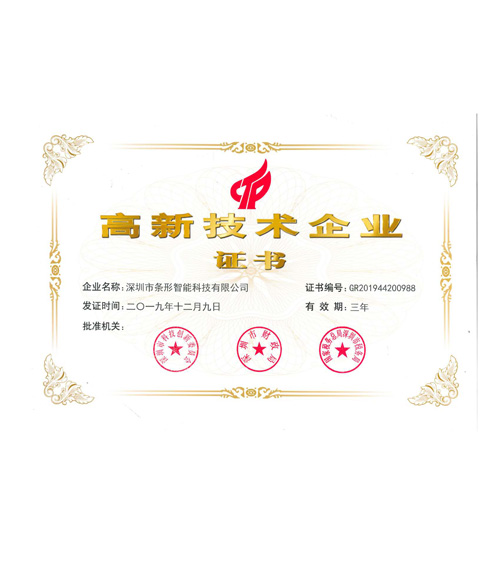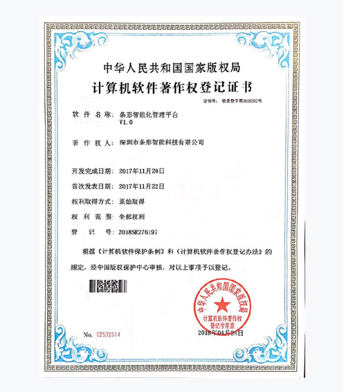 深圳條形智能先后通過并取得:全國工業產品生產許可證、ISO9001國家質量體系認證、CE認證、多項發明和實用新型專利,及多項國家軟件著作權。